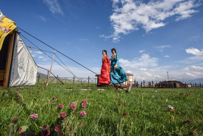 6月20日,祁連山生態(tài)牧場的兩名工作人員準(zhǔn)備為游客收拾帳篷賓館的房間。