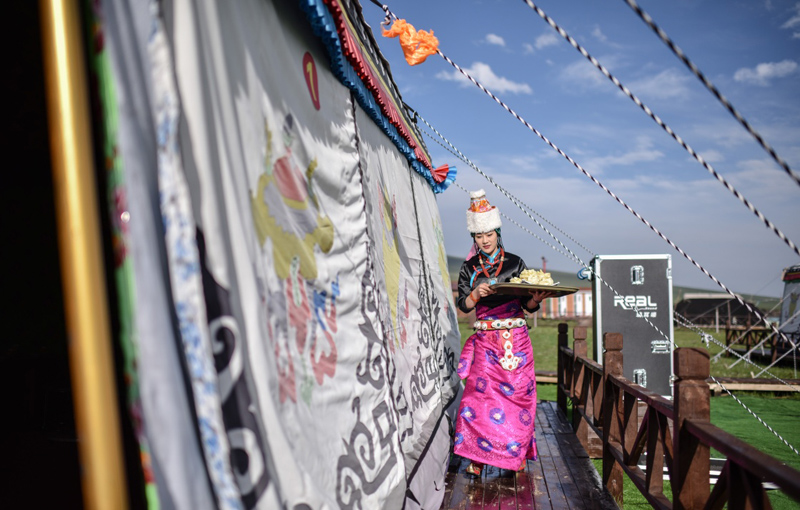 6月20日,祁連山生態(tài)牧場的一名工作人員在給游客送餐。