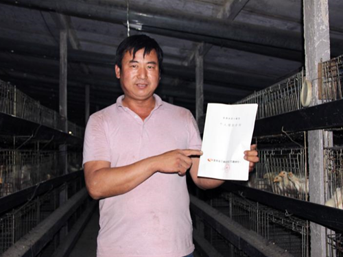 圖為6月25日,朱國強(qiáng)在自家雞舍內(nèi)向記者展示剛剛獲得農(nóng)商行10萬元續(xù)貸資金的金融扶貧貸款合同。