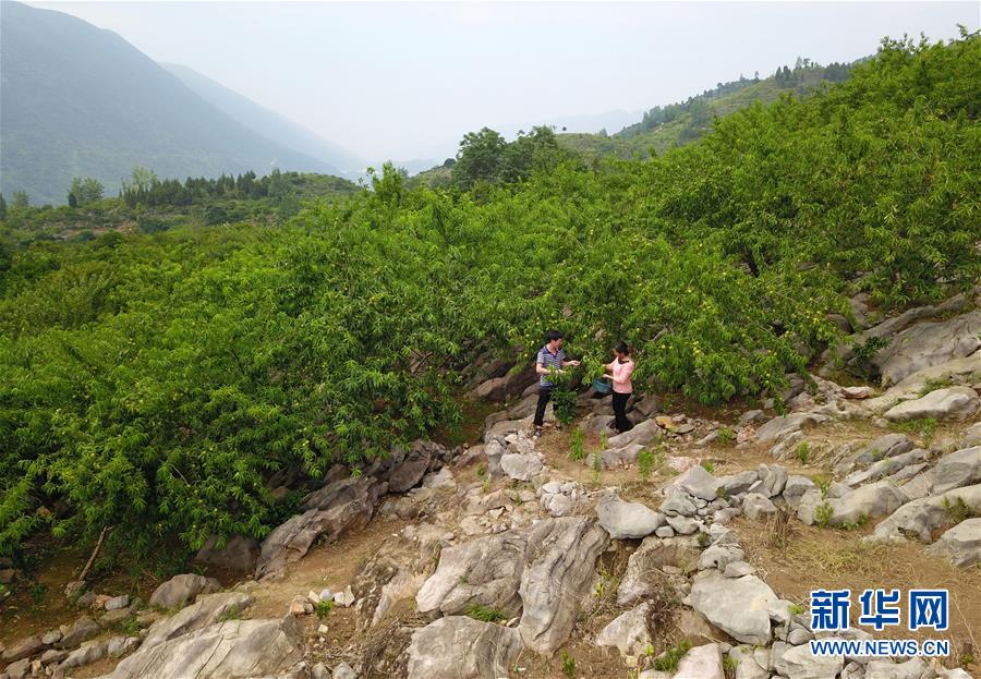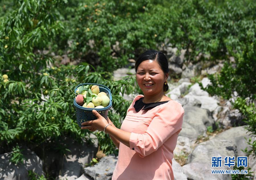 6月26日,農(nóng)民在貴州省印江縣朗溪鎮(zhèn)昔蒲村的石漠化治理區(qū)采摘桃子。