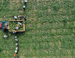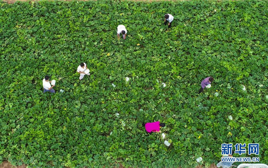 7月7日,在河北省故城縣建國鎮(zhèn)姜圈村蔬菜基地,種植戶在采摘冬瓜(無人機(jī)拍攝)。