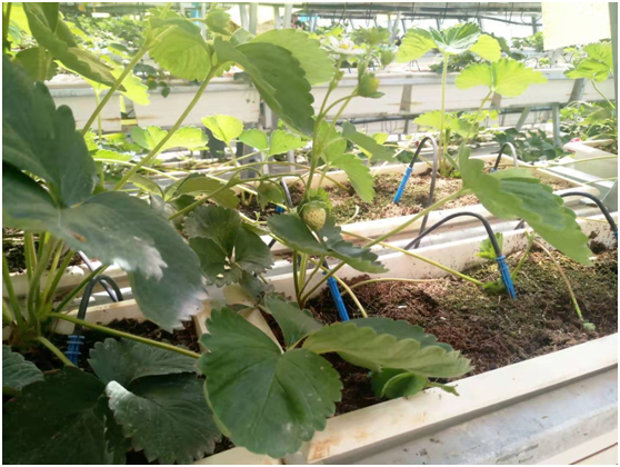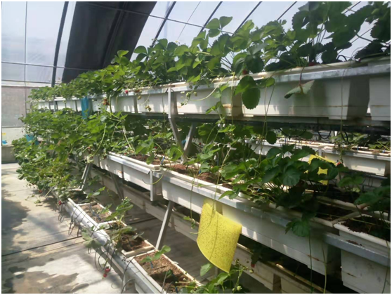 種植溫室采用智能化管理,土壤中插有輸送水分養(yǎng)料的軟管,水肥一體自動(dòng)添加。在種植草莓的溫室內(nèi)記者還見到支架上懸掛著粘蚊板,溫室的角落里擺放有蜂箱。工作人員解釋說溫室內(nèi)不噴灑殺蟲劑,利用蜜蜂授粉。