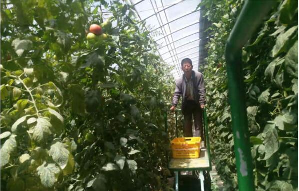 圖(番茄溫室內(nèi) 工人熟練使用軌道采摘)