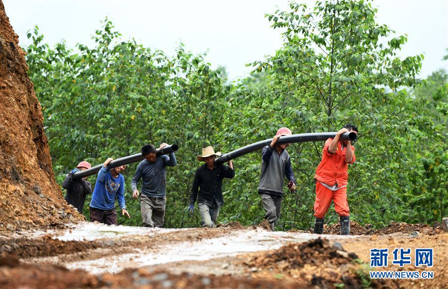 7月7日,農(nóng)民在貴州省普安縣地瓜鎮(zhèn)屯上村的“扶貧茶園”里搬運(yùn)水管,準(zhǔn)備修建茶園噴灌系統(tǒng)。