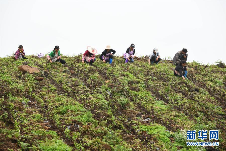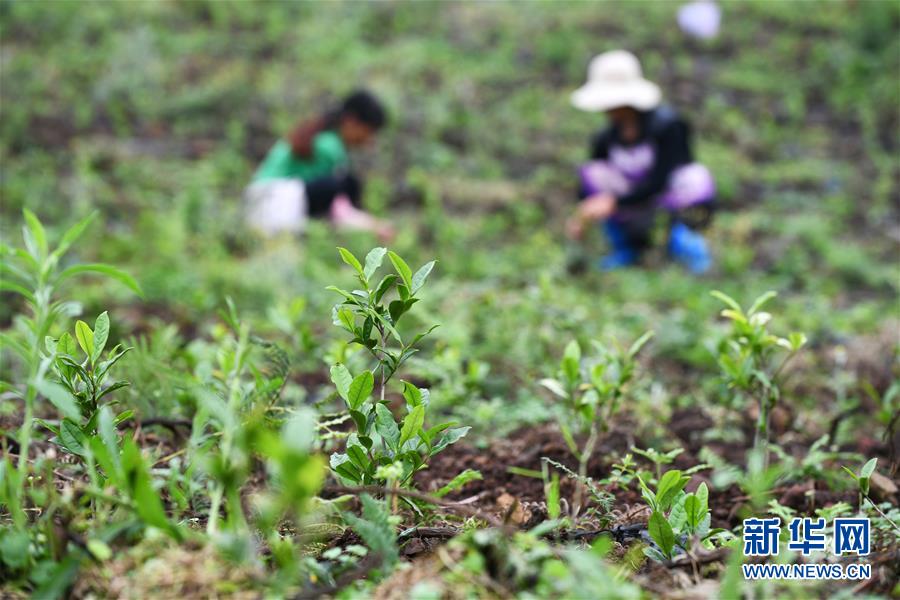 7月7日,農(nóng)民在貴州省普安縣地瓜鎮(zhèn)屯上村的“扶貧茶園”里給茶苗除草。