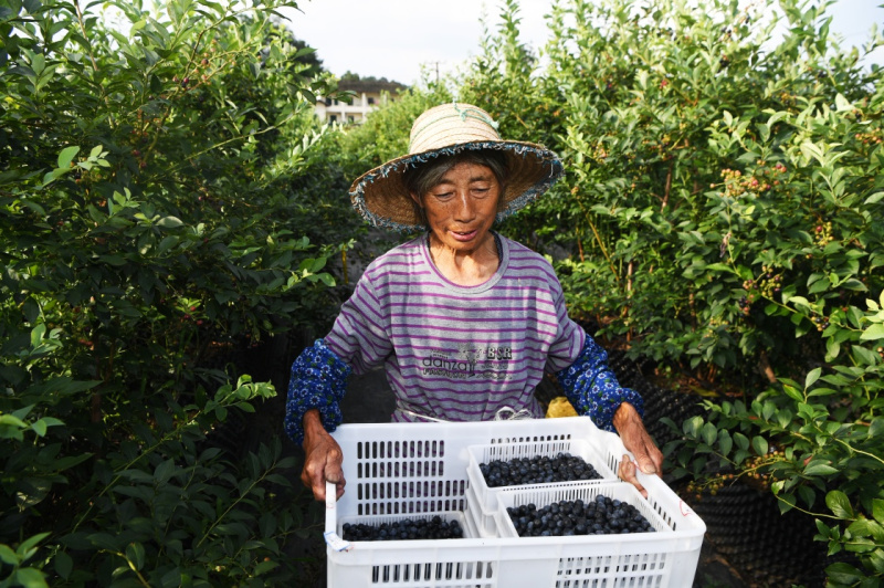 7月10日,村民在重慶南川興隆鎮(zhèn)金花村藍(lán)莓種植基地采摘藍(lán)莓。