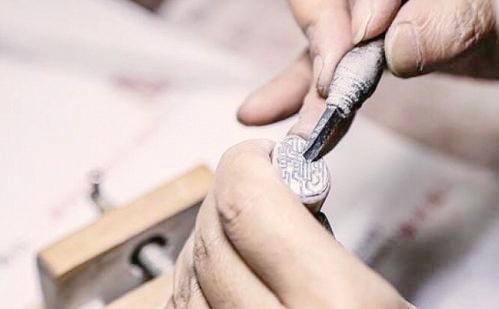 林前社區(qū)民間藝人在雕刻印章。