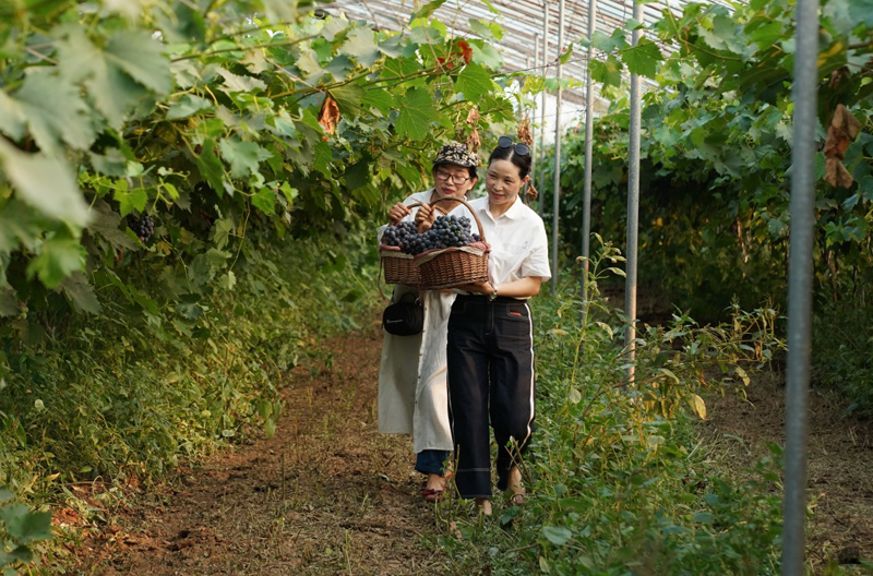 7月21日,游客在河北省巨鹿縣西郭城鎮(zhèn)一葡萄采摘園內(nèi)采摘葡萄。