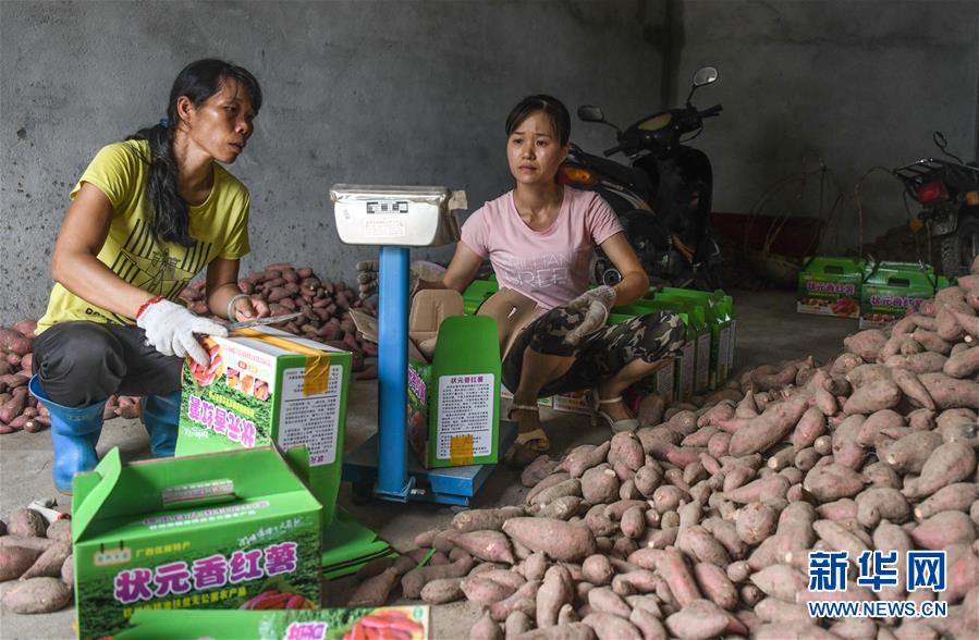 7月23日,欽州市欽南區(qū)犀牛腳鎮(zhèn)西寮村群眾將收獲的紅薯裝箱準(zhǔn)備外銷。