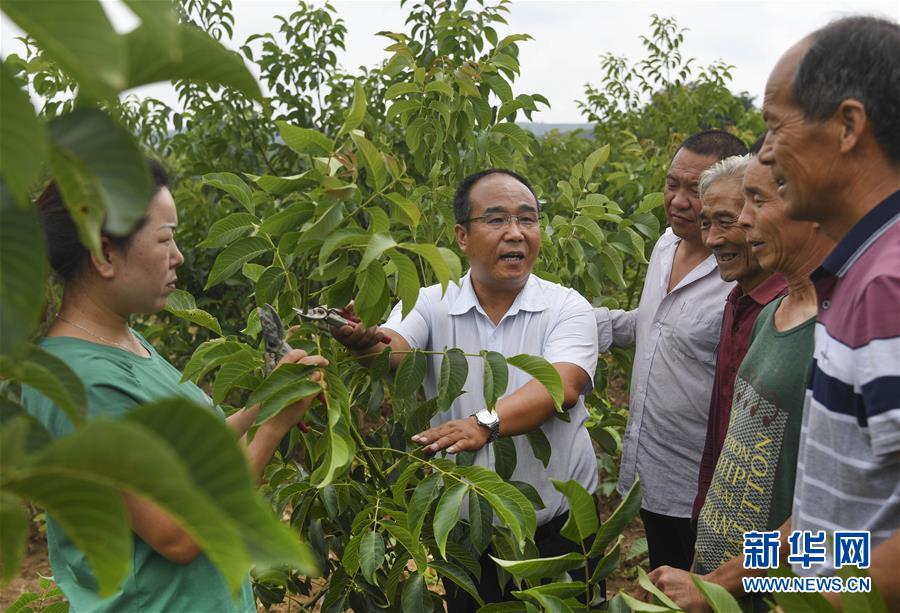 8月5日,盛鑫紅仁核桃專業(yè)合作社總經(jīng)理董兆斌(左二)在陜西洛南縣景村鎮(zhèn)八一村紅仁核桃示范基地為合作社成員講解夏季田間管理技術(shù)。