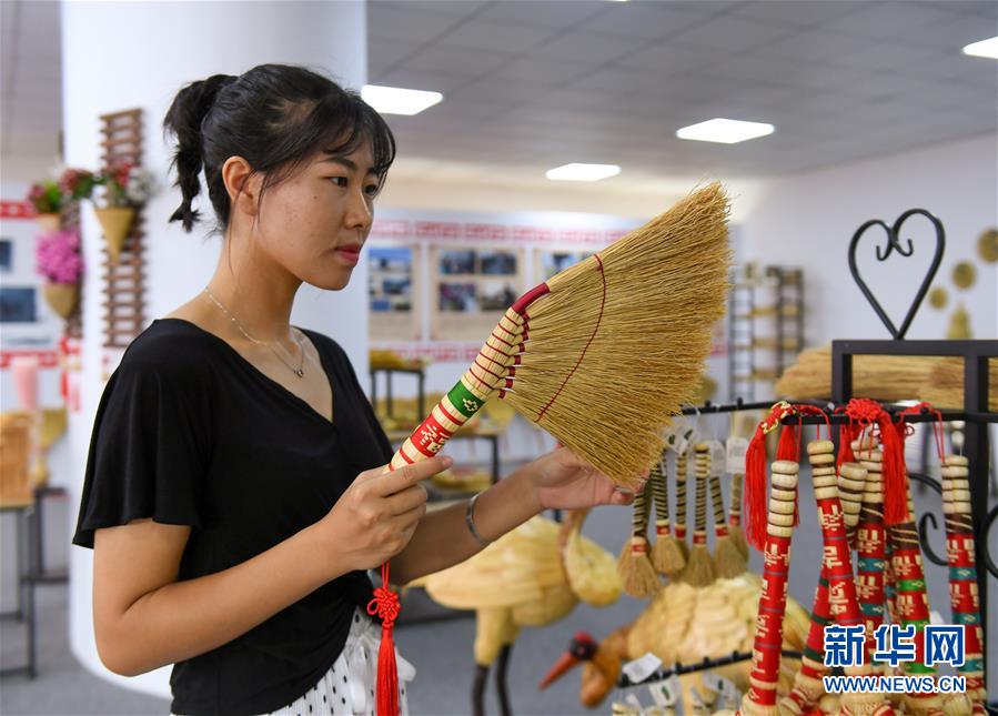 8月5日,游客在巴林左旗林東鎮(zhèn)白音溝村的展廳內(nèi)欣賞制作精美的笤帚。