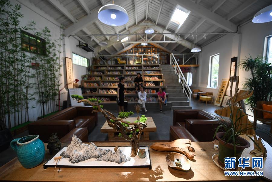 8月7日在妙西鎮(zhèn)一家鄉(xiāng)村小型文化綜合體內(nèi)拍攝的圖書休息區(qū)。