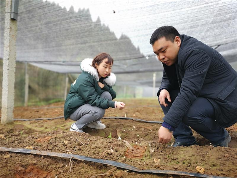 2019年3月,當?shù)責煵莨抉v村扶貧干部在查看羊肚菌長勢,為陳天順的管理提供指導。黃德磊 攝