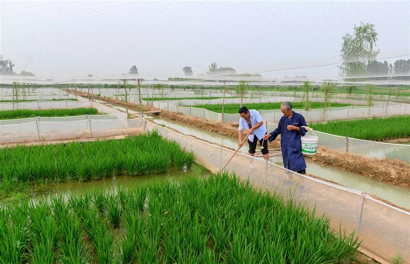 張五奎在稻田間給黑斑蛙喂食 馬紹磊 攝