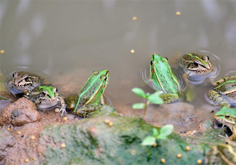 記者在現(xiàn)場(chǎng)看到,35畝稻田被切分成多塊長(zhǎng)條區(qū)域,區(qū)域中間長(zhǎng)著碧綠的稻苗,稻苗四周挖了一圈淺淺的水溝,水溝向外連著田埂。張五奎投喂飼料后,起初只是零星幾只“貪吃”的黑斑蛙從稻苗叢中跳出來(lái),緊接著,黑斑蛙成群結(jié)隊(duì)地?fù)湎蝻暳,不一?huì)兒就爬滿了田邊的投食板,整個(gè)田塊“呱呱呱”的叫聲此起彼伏。大約過(guò)了10多分鐘,飽餐一頓的黑斑蛙或“撲通”一聲跳回水中嬉戲,或返回稻苗下納涼“消食”。