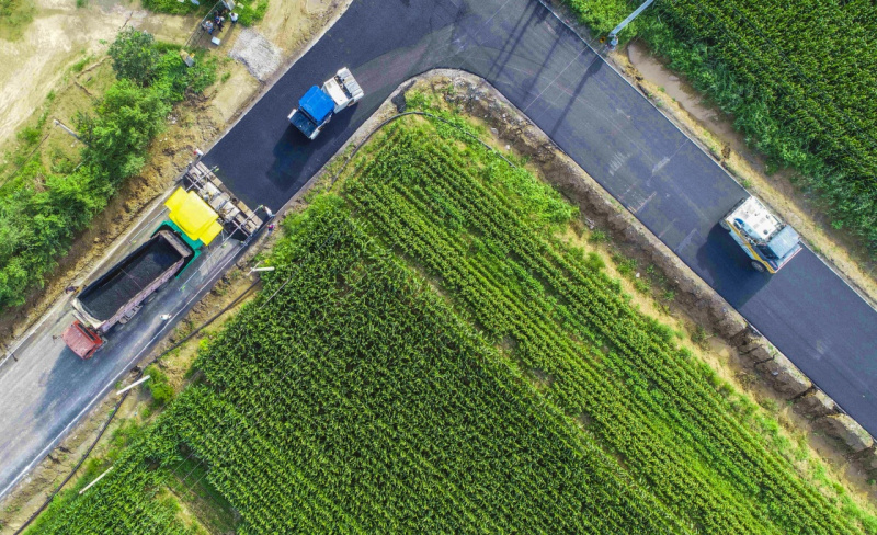 8月15日,在河北省棗強(qiáng)縣大營鎮(zhèn)南石村,壓路機(jī)在夯實(shí)剛鋪好的鄉(xiāng)村公路(無人機(jī)拍攝)。