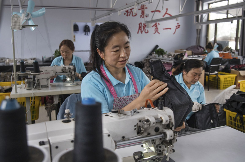 8月22日,廣靈縣壺泉鎮(zhèn)聚和村村民李臘梅在本村的“扶貧車間”加工背包。聚和村是一個移民搬遷村,駐村工作隊引進河北白溝的箱包加工項目,190人實現(xiàn)脫貧增收。