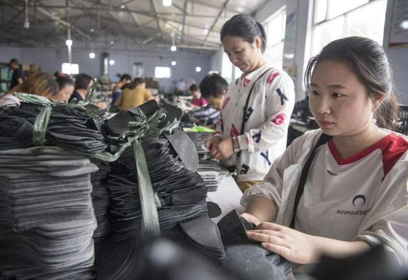 8月22日,廣靈縣壺泉鎮(zhèn)商村村民在騰翔鞋服有限公司的“扶貧車間”務(wù)工。