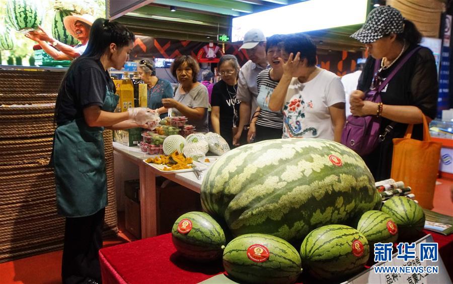 9月11日,在北京海淀區(qū)青龍橋街道車客家園社區(qū)店扶貧專柜展示的北京大興區(qū)老宋瓜王合作社在內(nèi)蒙古察右后旗扶貧基地種植的百斤大西瓜。