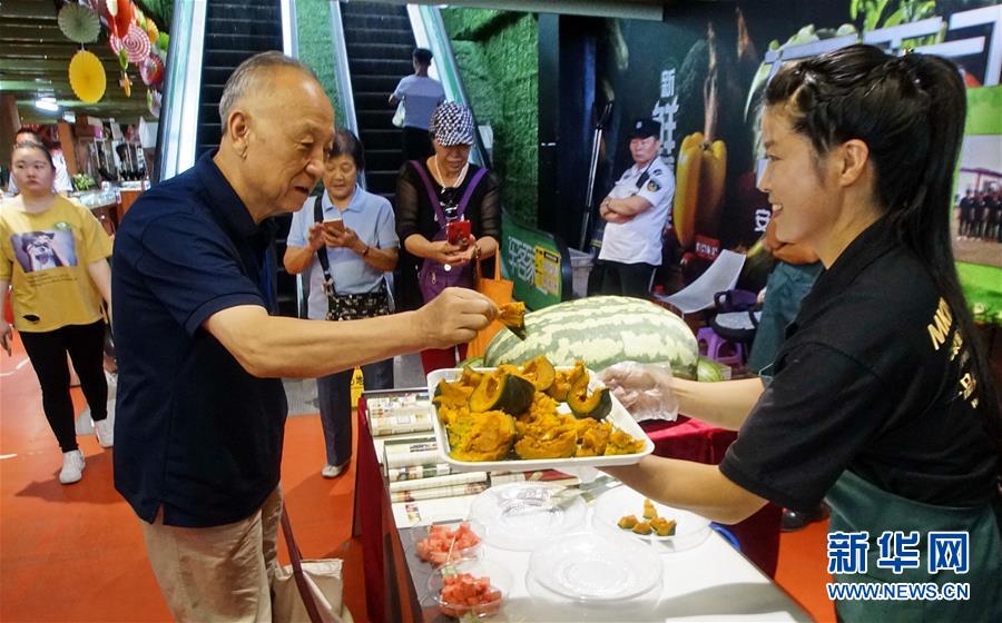 9月11日,在海淀區(qū)青龍橋街道車客家園社區(qū)店扶貧專柜,顧客在品嘗貧困縣出產(chǎn)的南瓜。