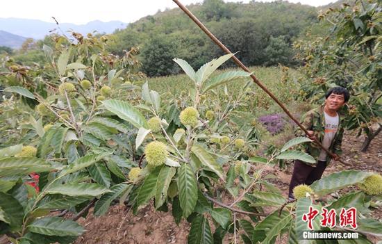 時(shí)值9月下旬,河北省贊皇縣西石家莊村的農(nóng)戶祁堅(jiān)強(qiáng)很忙,因?yàn)樗沂喈板栗已經(jīng)到了成熟的季節(jié)。近些天,他都要和妻子到山上忙著打栗子,長(zhǎng)長(zhǎng)的竹竿敲下去后,形似綠毛球的板栗紛紛落地,妻子拿起鑷子把散在地下的板栗收到桶里。