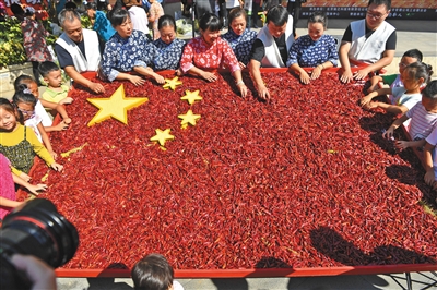 郭莊子農(nóng)時(shí)薈上,村民們用百余斤辣椒拼成五星紅旗。新京報(bào)記者 李木易 攝郭莊子農(nóng)時(shí)薈上,村民們用百余斤辣椒拼成五星紅旗。新京報(bào)記者 李木易 攝