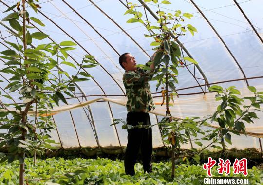 甘肅慶陽市西峰區(qū)肖金鎮(zhèn)蔬菜基地種植大戶唐峰正在修剪櫻桃樹。 耿洋洋 攝