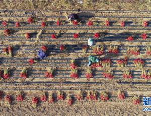 10月9日,法庫縣秀水河子鎮(zhèn)長崗子村村民在田間捆扎辣椒(無人機拍攝)。