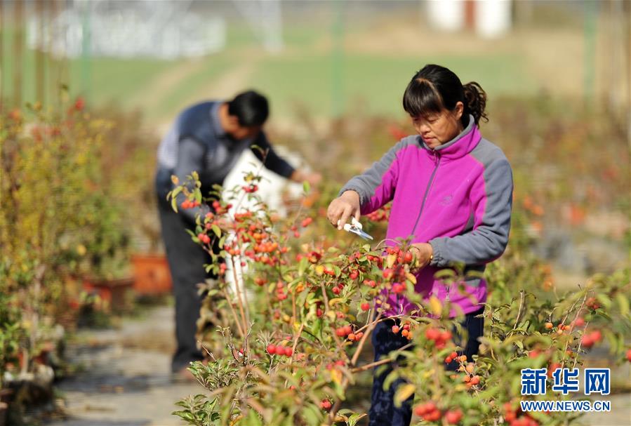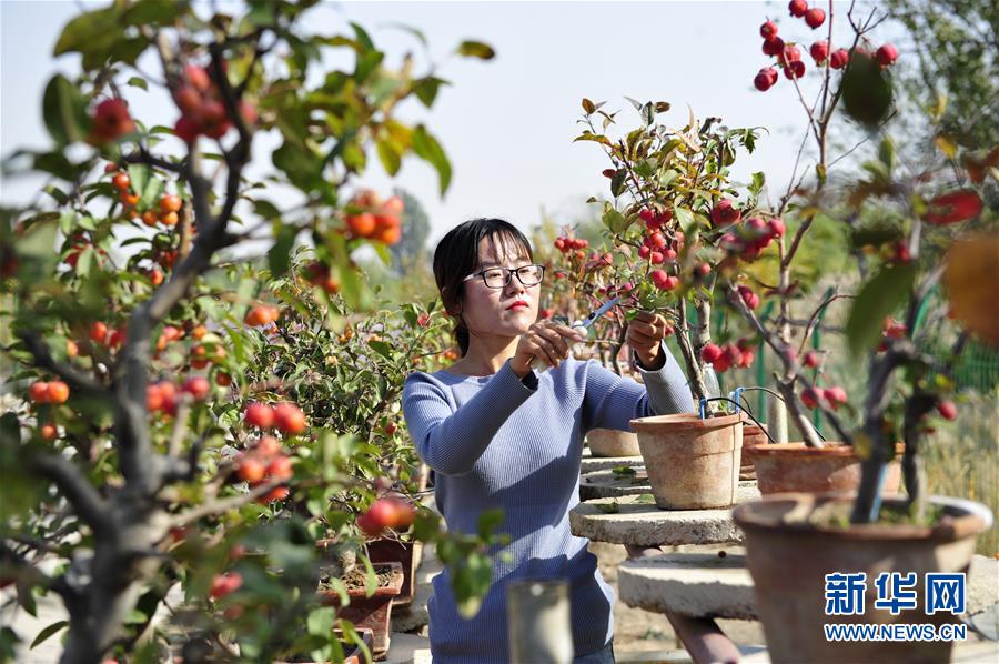 11月4日,河北省泊頭市四營鄉(xiāng)黃官屯村一個盆栽果樹基地的員工在打理盆栽果樹。