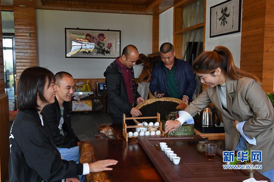 武夷山市星村鎮(zhèn)黃村村茶農(nóng)林靜(右一)為顧客泡茶。她家擁有茶園300余畝,年收入200多萬元(11月5日攝)。新華社記者 馬平 攝