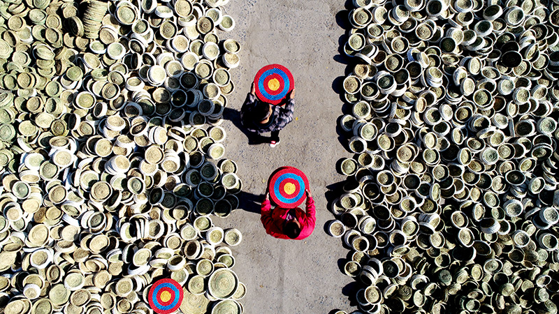 11月20日,山東省臨沂市郯城縣馬頭鎮(zhèn)草編合作社社員在晾曬用秸稈編制的工藝品(無人機拍攝)。