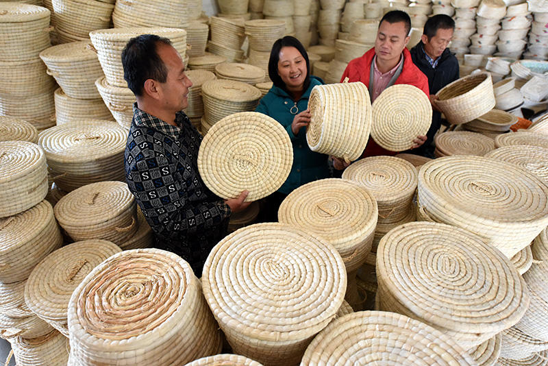 11月20日,山東省臨沂市郯城縣馬頭鎮(zhèn)草編合作社銷售人員王慶玲(左二)向客商介紹用秸稈編制的工藝品。