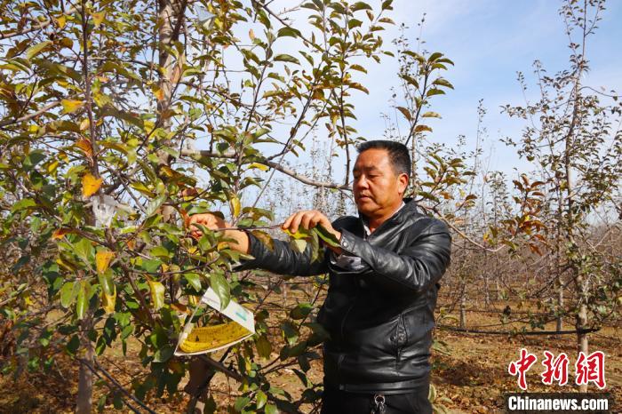 甘肅慶陽市西峰區(qū)肖金鎮(zhèn)芮嶺村大唐果蔬種植農(nóng)民專業(yè)合作社負(fù)責(zé)人唐社明正在安裝果樹生物滅蟲板!芈斅敗z