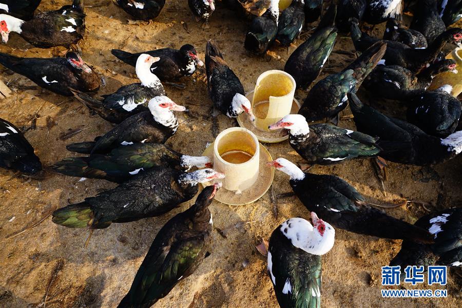 12月11日,河北省邢臺市公安局駐新河縣白穴口村扶貧工作隊飼養(yǎng)的非洲雁在吃食。
