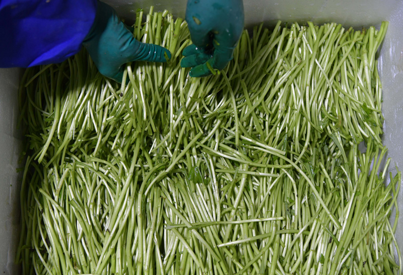 12月24日,在南昌縣幽蘭鎮(zhèn)竹林村藜蒿種植合作社內(nèi),當(dāng)?shù)剞r(nóng)戶在處理剛收割的藜蒿準(zhǔn)備裝箱外銷。