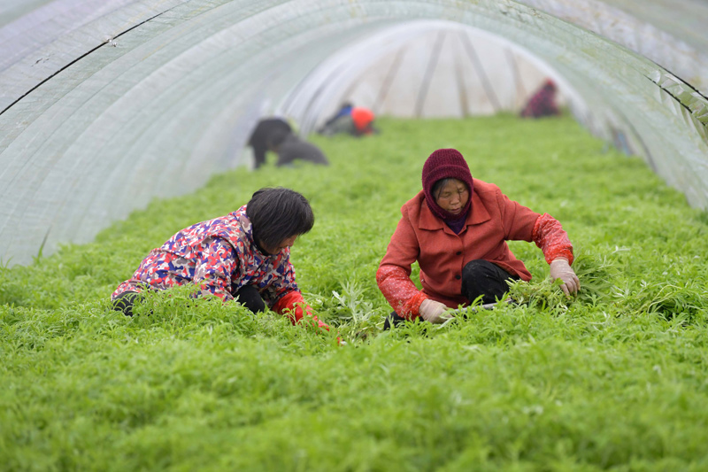12月24日,在南昌縣幽蘭鎮(zhèn)竹林村藜蒿種植合作社內(nèi),當(dāng)?shù)剞r(nóng)戶在溫棚內(nèi)收割藜蒿。