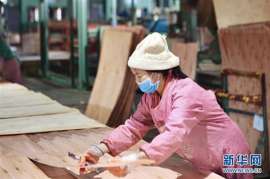 12月25日,在扶綏縣山圩產(chǎn)業(yè)園,一家木業(yè)公司工人在加工木板。