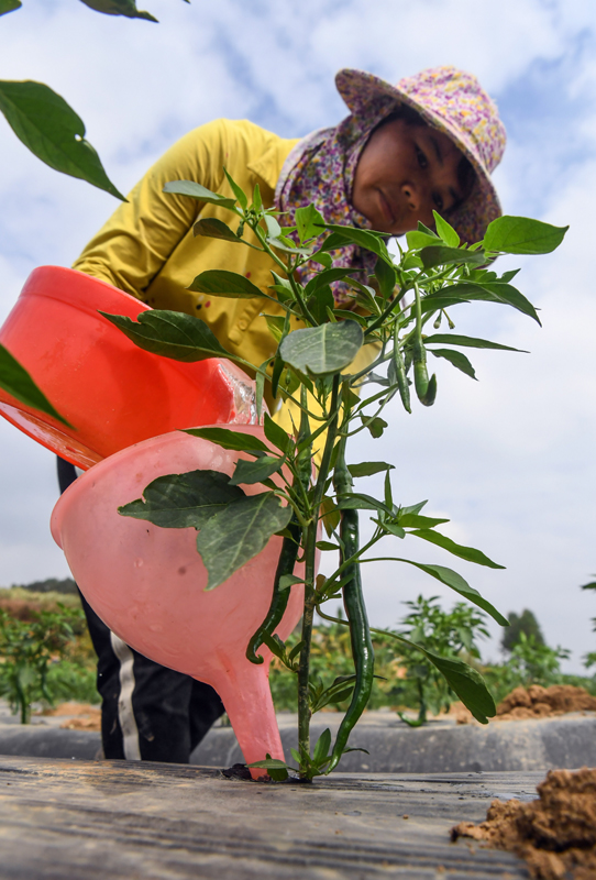 1月6日,欽州市欽南區(qū)那麗鎮(zhèn)的一名椒農(nóng)在給辣椒澆水。