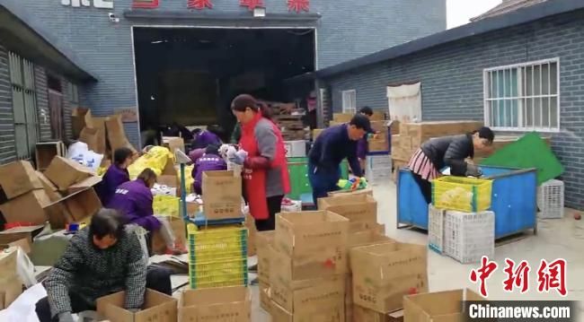 在李方公司的院子里,色澤鮮艷的蘋果被成堆安置在收納箱中,當地果農正進行分揀、包裝、封盒等操作。李方介紹說,“年貨節(jié)”期間,土產銷量比平時高出60%,原本只有1家快遞運送,在官方協(xié)調下現增至3家快遞。