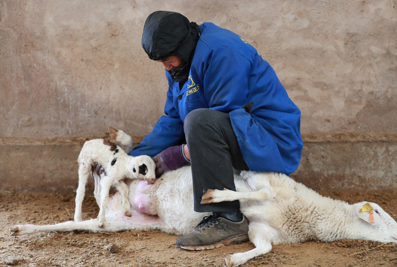 1月18日,廣河縣廣盛產(chǎn)業(yè)發(fā)展有限責(zé)任公司的飼養(yǎng)員在幫助剛出生的小羊吃奶。