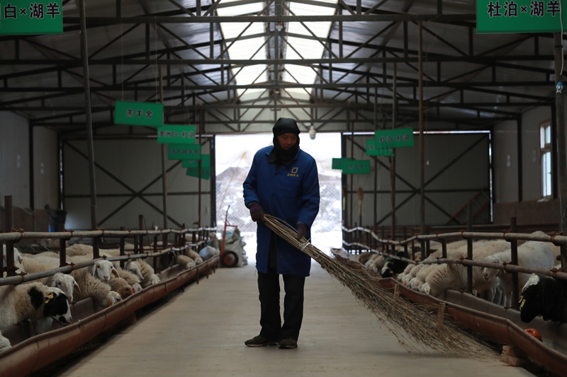 1月18日,廣河縣廣盛產(chǎn)業(yè)發(fā)展有限責(zé)任公司的飼養(yǎng)員在打掃衛(wèi)生。