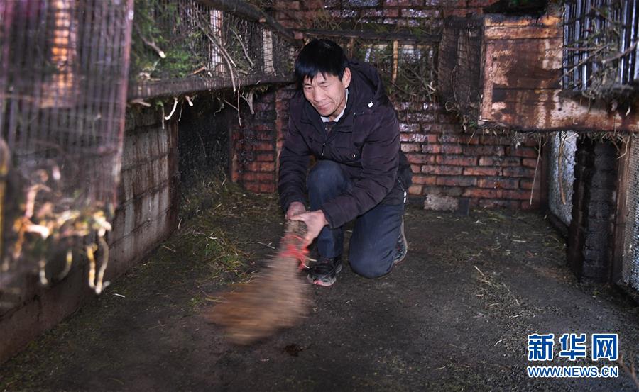 1月19日,洛南縣景村鎮(zhèn)何溝村村民張仲會在飛鼠飼養(yǎng)棚里收集飛鼠糞便。