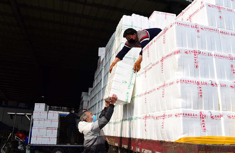 2月4日,在位于河南省鄭州市中牟縣的河南最大的農(nóng)產(chǎn)品批發(fā)市場——河南萬邦國際農(nóng)產(chǎn)品物流城,工作人員將新采購的蔬菜卸車。