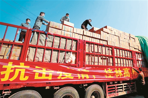 一批批愛(ài)心企業(yè)捐贈(zèng)的醫(yī)療物資陸續(xù)裝車運(yùn)往湖北疫情防控一線。何平江/攝