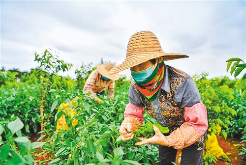 海口市瓊山區(qū)農(nóng)民在蔬菜基地采摘辣椒。