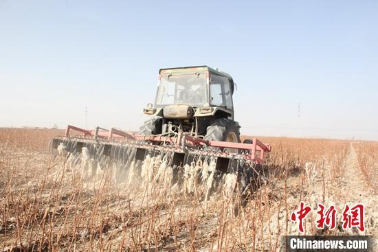 23日開(kāi)始,農(nóng)機(jī)手楊陽(yáng)正在使用大型鉤膜機(jī)對(duì)地里的殘膜進(jìn)行回收。王雯 攝