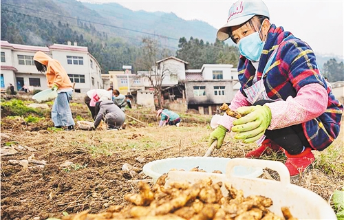 天麻種植基地里,18名村民正戴著口罩進(jìn)行“灌麻”。