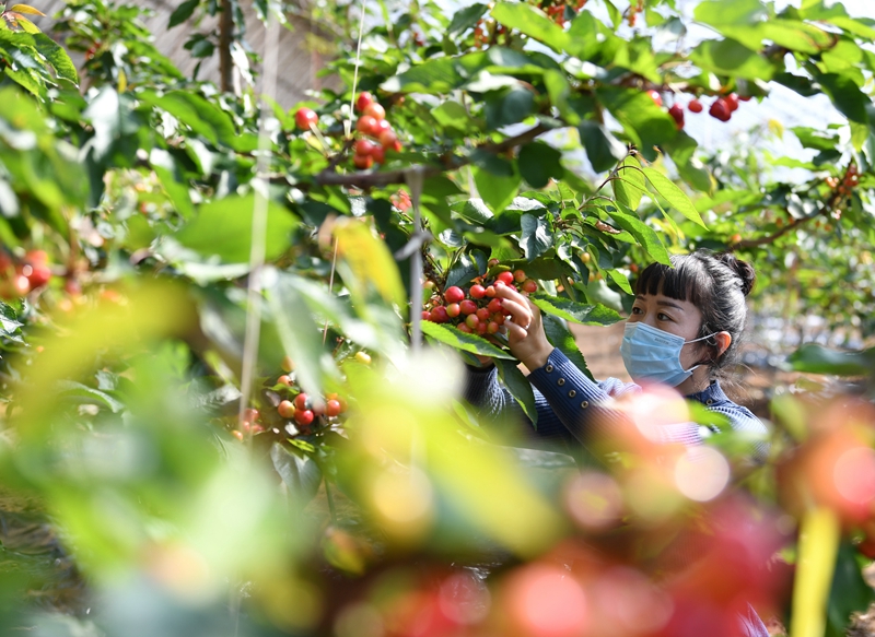 3月12日,在樂亭縣樂亭鎮(zhèn)韓坨村一處設(shè)施農(nóng)業(yè)生產(chǎn)基地,工人在大棚內(nèi)管理即將成熟的櫻桃。