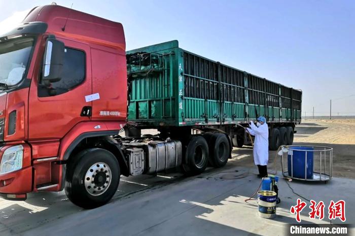 工作人員在裝卸前后對(duì)車輛進(jìn)行全方位消殺工作。靈武市農(nóng)業(yè)農(nóng)村局 供圖