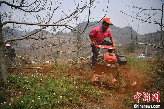 圖為3月17日,當(dāng)?shù)卮迕駰钯F興的妻子在蘋(píng)果田里勞作。中新社記者 劉冉陽(yáng) 攝